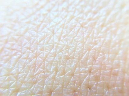 肌のキメが粗いとか整っているとかよくわからないという人もいるでしょう。そんな場合は手の甲を見てください。表面に細かい線のようなシワ、この網目状になっている溝を「皮溝」と呼びます。皮溝に囲まれた三角や四角の形を「皮丘」と呼びさらに毛穴が加わった状態で構成されたものが「肌のキメ」です。