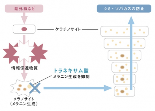 肌は紫外線やストレスなどが原因でくすみやシミの原因となるメラニンが生成されてしまうのですが、トラネキサム酸はメラニン生成をブロックしてくれるので、くすみやシミに非常に効果があります。